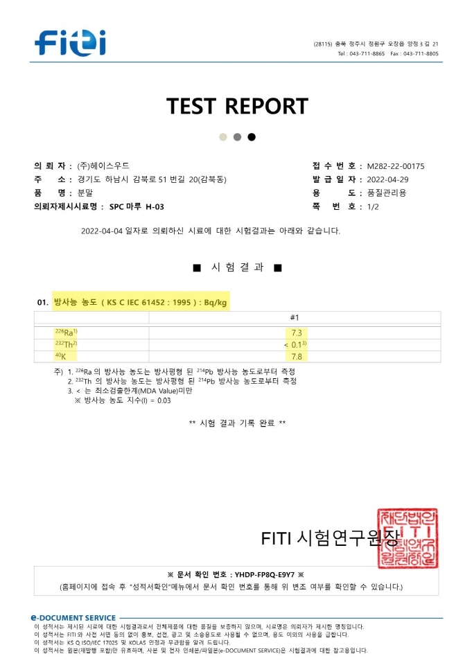 방사능지수     기준 1이하        헤이스SPC마루: 0.03
